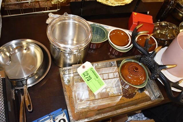 Various Kitchen Goods Including Spice Rack, Flour Jar, Pans, Bowls, Etc.