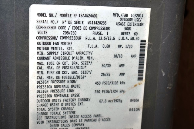 Rheem Believed to Be 2 1/2 Ton Outdoor Air Conditioning Compressor, Single Phase 60hZ, See Photos for Complete Manufacture Tag