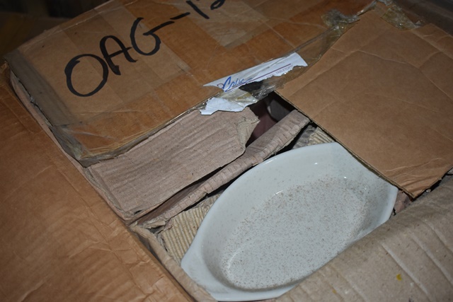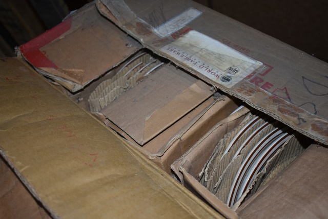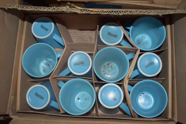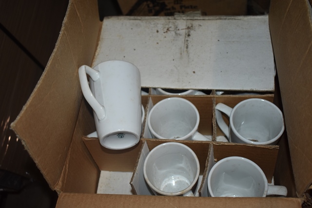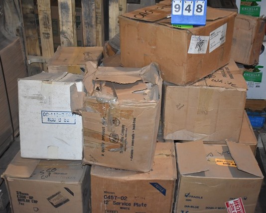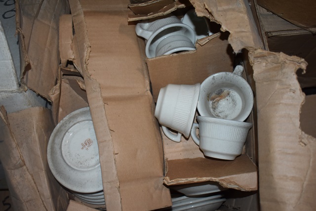 Pallet of dishware including plates, service plates, coffee cups, etc.