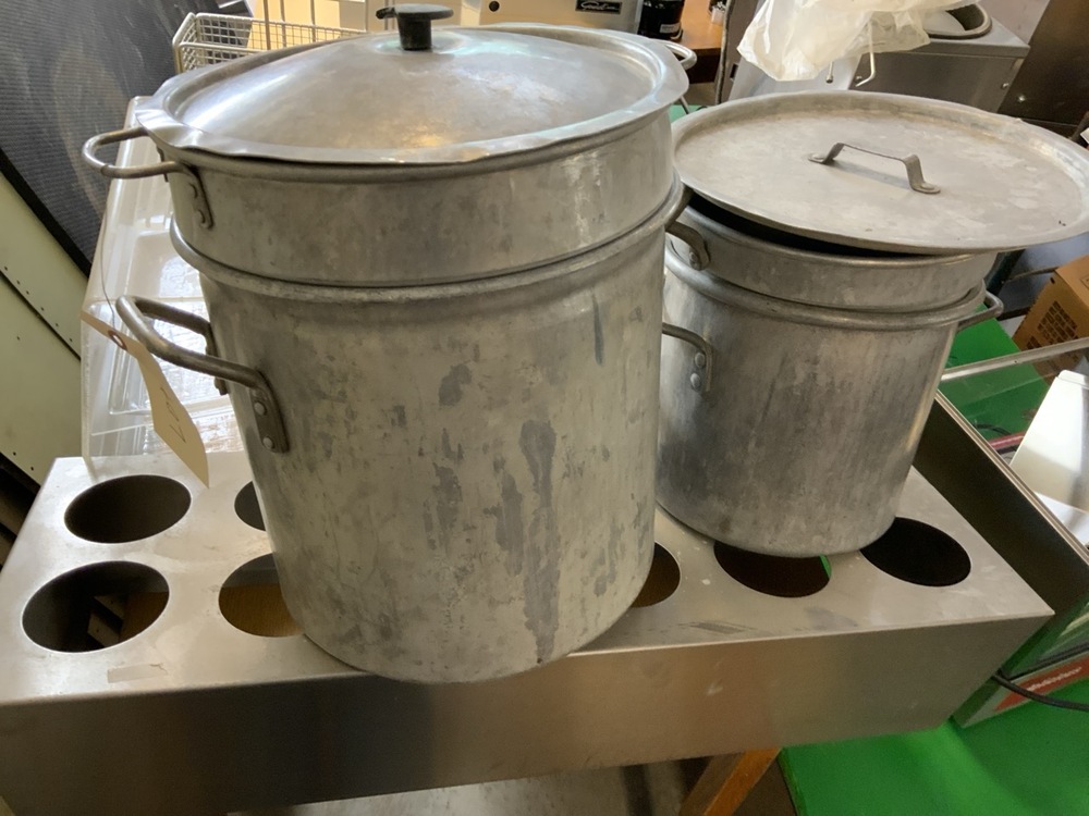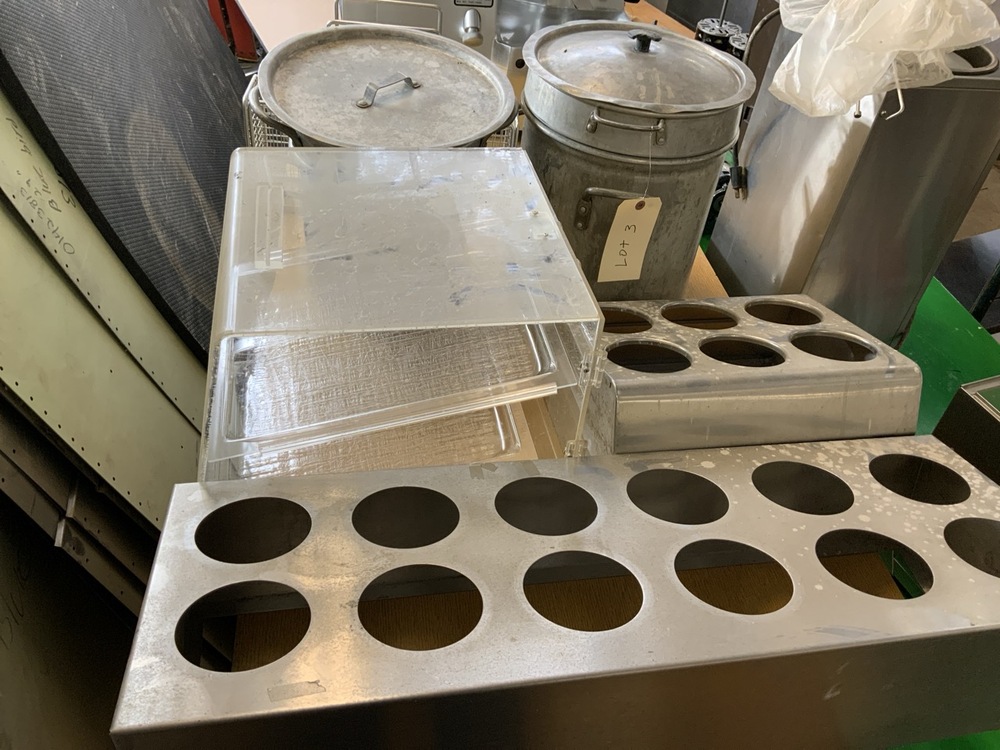 Kitchenware Lot Including Stock Pots with Lids, Stainless Steel Organizers, and Pastry Display Case