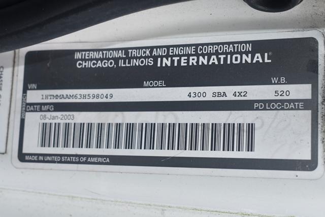 2003 International 4300 Box Truck VIN# 1HTMMAAM6H598049, Approx. Mileage 73,784 +/-, Starts, Runs and Moves. Has A Broken Brake Line, Hydraulic Brakes, Diesel, Automatic, DT466 Engine, GVWR 25,500, 10R225 Tires, 18' Box, Transferable Paperwork Available At Removal. Located at: 436 Quaker Road, Queensbury, NY 12804.