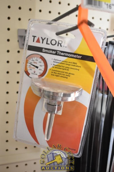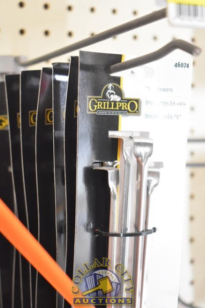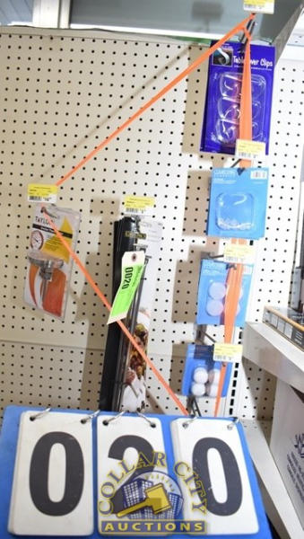 PEG BOARD LOT CONSISTING OF SMOKER THERMOMETER, V SKEWERS, ASSORTED TABLE COVER CLIPS, AND BUMPERS FOR GLASS TOP TABLES