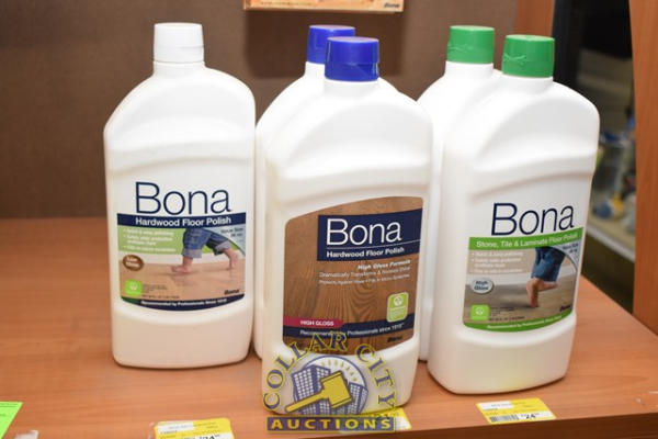 BONA DISPLAY RACK WITH CONTENTS CONSISTING OF PREMIUM SPRAY MOP, FLOOR CLEANERS, AND DISPLAY SCREEN
