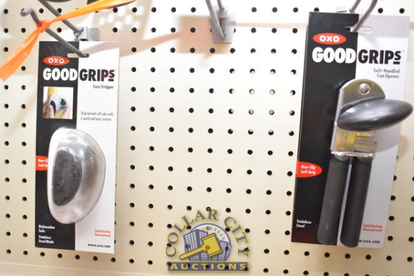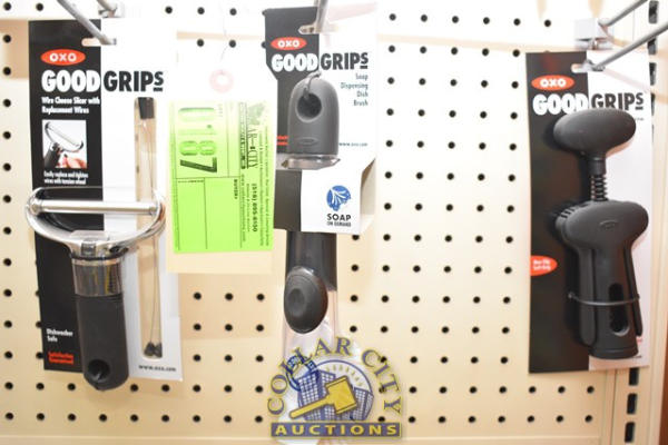 LOT OF OXO CAN OPENERS, CHEESE SLICER, SOAP DISPENSING BRUSH, ETC.