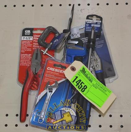 ASSORTED TOOL LOT OF LINEMAN'S PLIERS, SCREWDRIVERS, SMALL PIPE WRENCH, ETC.