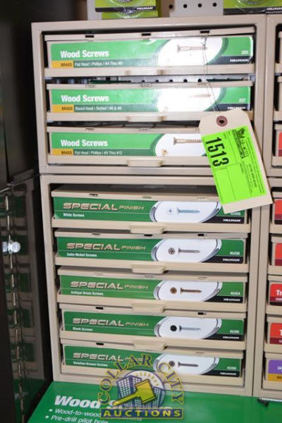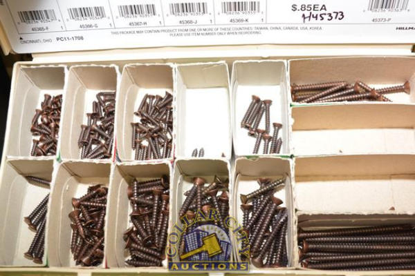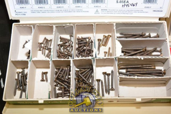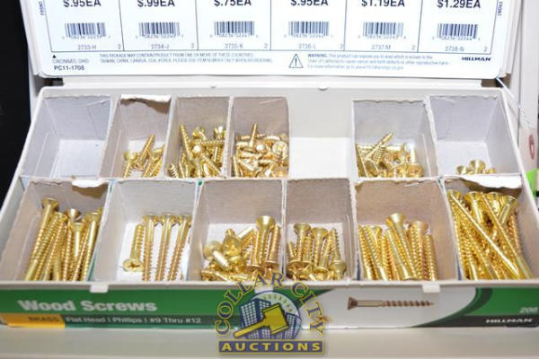 ORGANIZER BIN OF WOOD SCREWS, BRASS AND WHITE SCREWS, SATIN NICKLE SCREWS, ETC.