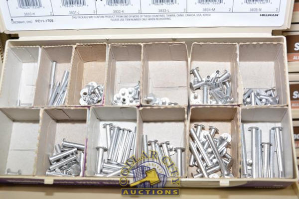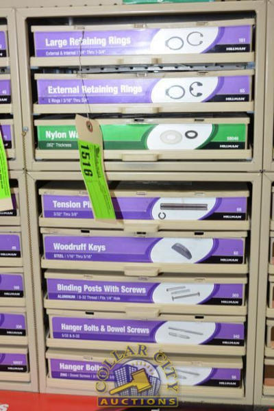 ORGANIZER BIN OF SNAP RINGS, NYLON WASHERS, TENSION PINS, WOODRUFF KEYS