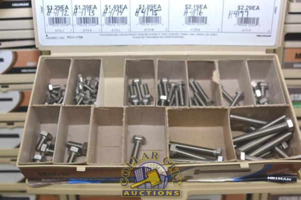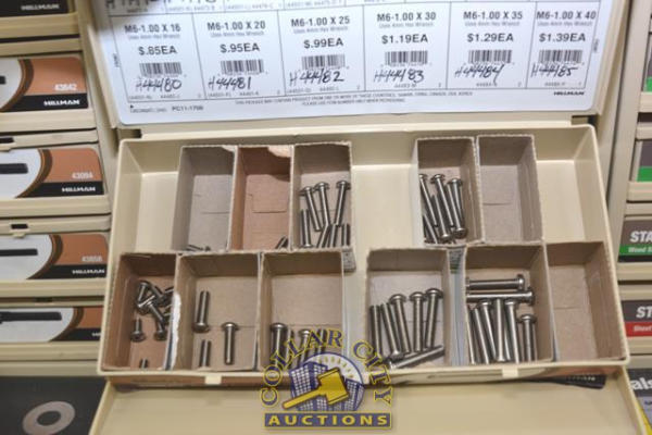 ORGANIZER BIN WITH CONTENTS CONSISTING OF METRIC SOCKET HEAD CAP SCREWS, STAINLESS STEEL SPLIT AND LOCK FLAT WASHERS, METRIC HARDWARE