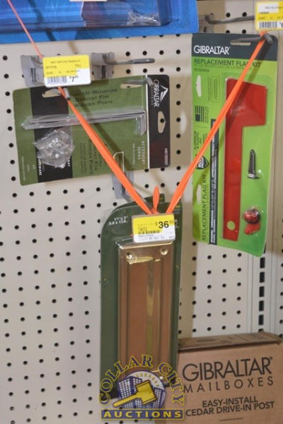 LOT CONSISTING OF MAILBOX REPLACEMENT FLAG KIT, MOUNTING BRACKETS FOR WOODEN POSTS, MAIL SLOTS