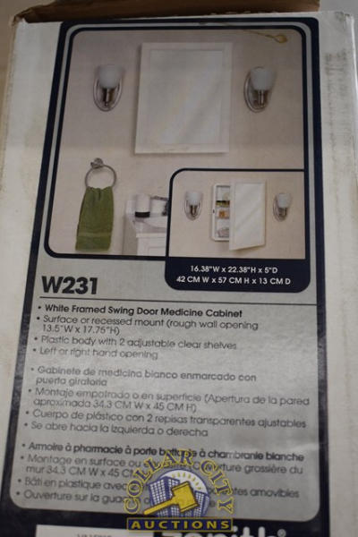WHITE FRAME SWING DOOR MEDICINE CABINET, APPROX. 13 1/2" WIDE X 17 3/4" TALL