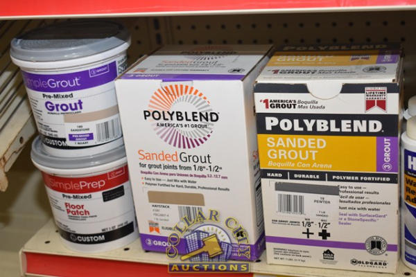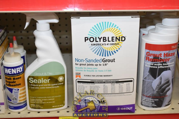 SHELF LOT OF GROUT, GROUT AND TILE SEALER, WALL BASE REPAIR ADHESIVE, ETC.