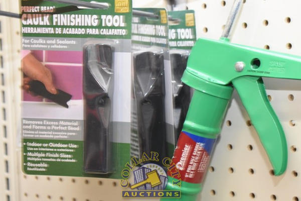 LOT OF CAULK GUN, CAULK FINISHING TOOL, CAULK STRIP