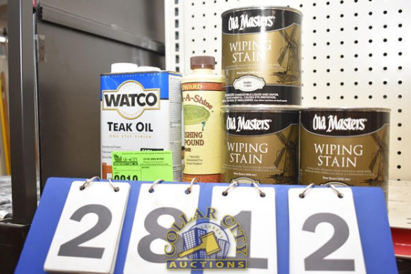 SHELF LOT OF WIPING STAIN, POLISHING COMPOUND AND TEAK OIL