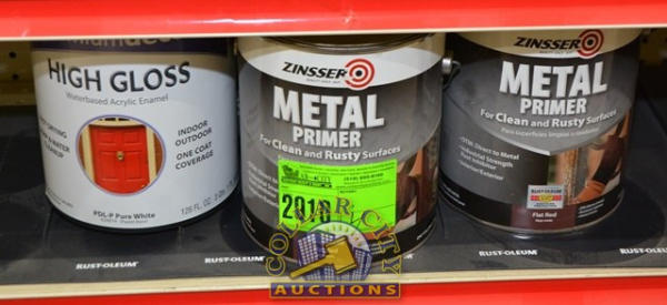 LOT OF 4 GALLONS OF ZINSSER METAL PRIMER AND PREMIUM DÉCOR HIGH GLOSS ENAMEL INDOOR/OUTDOOR PAINT