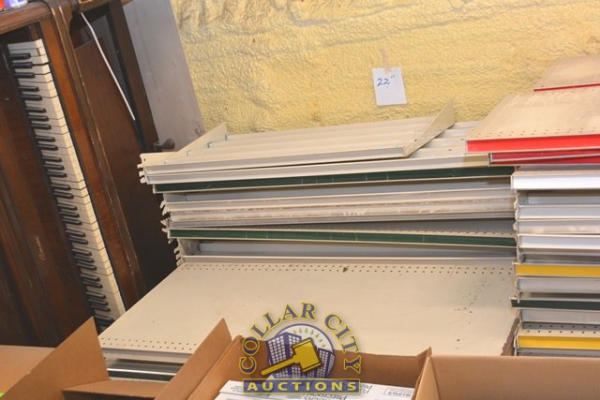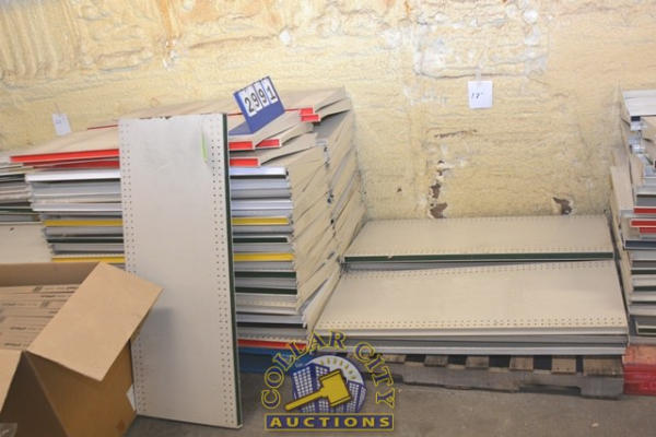 LARGE LOT OF GONDOLA SHELVING FROM 4' X 22", 4' X 17", 4' X 15", 4' X 16", 4' X 13", 4' X 10" (CANNOT BE REMOVED UNTIL AFTER REGULAR SCHEDULED REMOVAL)
