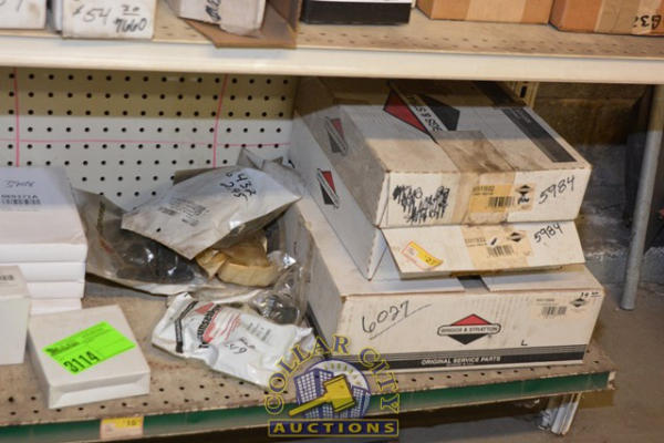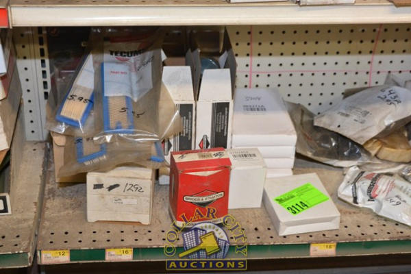 SHELF LOT OF BRIGGS & STRATTON PARTS MOSTLY CONSISTING OF PLASTIC COVERS, FILTERS, RECOIL PARTS
