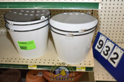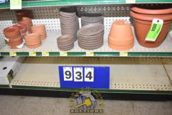 SHELF LOT OF FLOWER POTS AND FLOWER POT SAUCERS