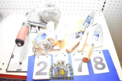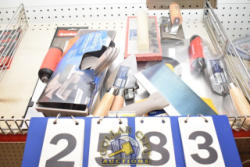 LOT OF DRYWALL TAPING KNIVES, DRYWALL TAPE HOLDER AND DRYWALL HAMMER