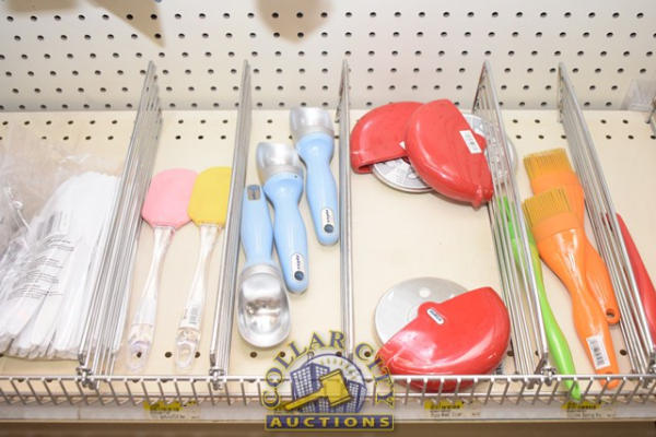SHELF LOT OF ASSORTED UTENSILS AND BOWLS