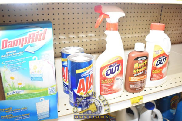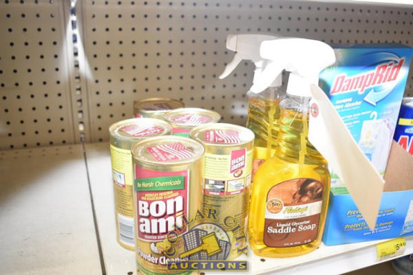 SHELF LOT OF IRON OUT STAIN REMOVER, SADDLE SOAP, AND CLEANSER