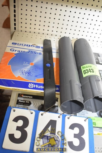 LOT CONSISTING OF HUSQVARNA 1" ARBOR SAW BLADE TRIMMER HEAD, BLOWER ATTACHMENTS AND REPLACEMENT MOWER BLADE