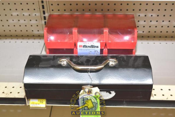 SMALL METAL TOOLBOX AND 6-PACK OF AKROBINS