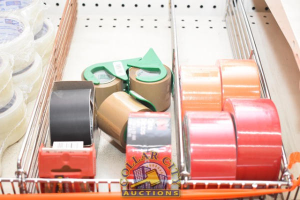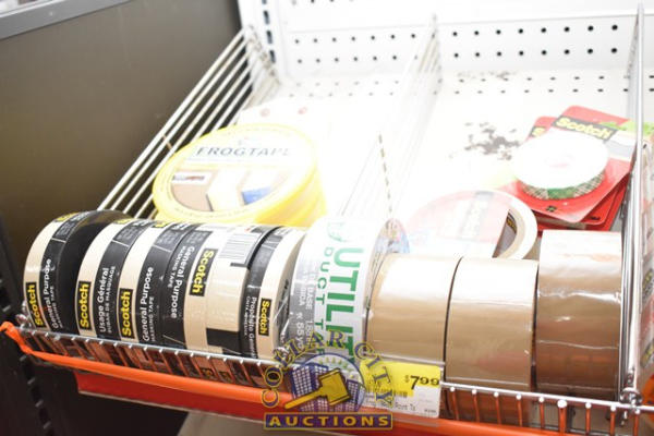 SHELF LOT OF GENERAL PURPOSE MASKING TAPE, FROG TAPE, SHIPPING TAPE, MOVING TAPE, ETC.