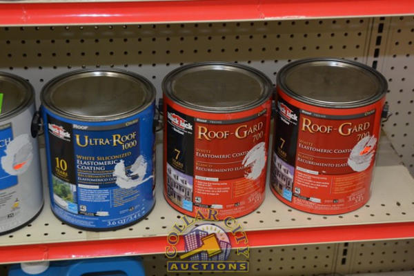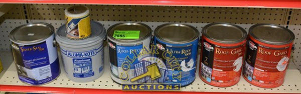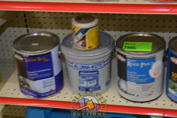 LOT OF 2 GALLONS OF BLACK JACK ROOF GUARD 700, 1 GALLON OF BLACK JACK ULTRA ROOF 1000, 1 GALLON OF BLACK JACK WHITE ROOF PATCH, 1 GALLON OF ALUMA COAT AND 1 GALLON OF BLACK JACK SILVER SEAL 300 AND A ROLL OF SEAM TAPE