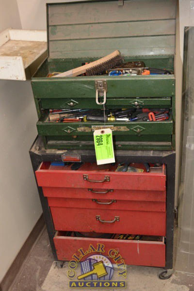 ROLL AROUND TOOLBOX WITH CONTENTS OF TOOLS CONSISTING OF SCREWDRIVERS, PLIERS, POP RIVET GUN, WIRE BRUSH, ETC.