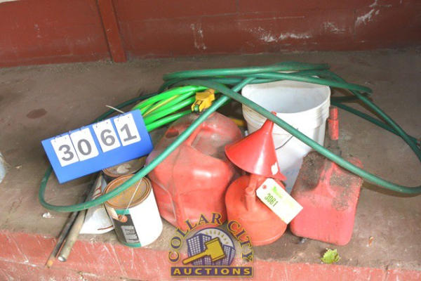 LOT OF GAS CANS, GARDEN HOSE, PAINT