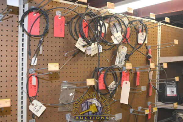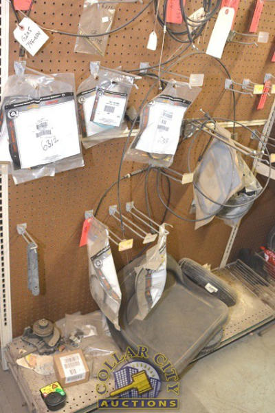 PEGBOARD LOT OF ASSORTED SMALL ENGINE REPAIR PARTS CONSISTING OF CABLES, SEAT, TIRE, ETC.