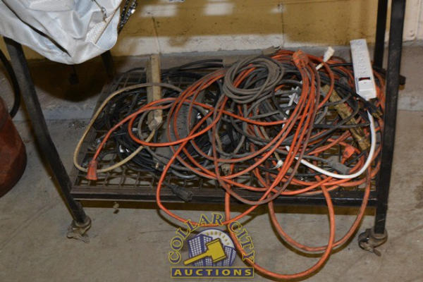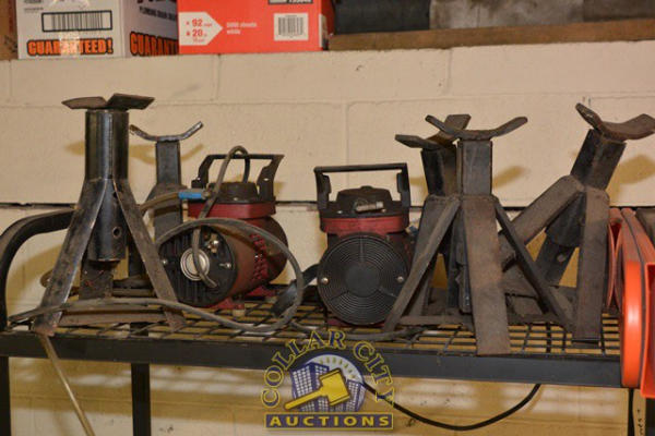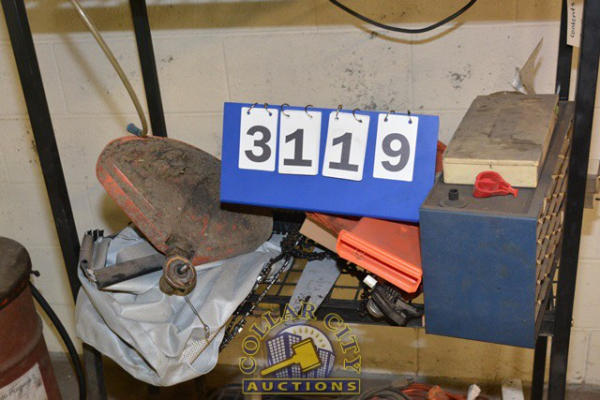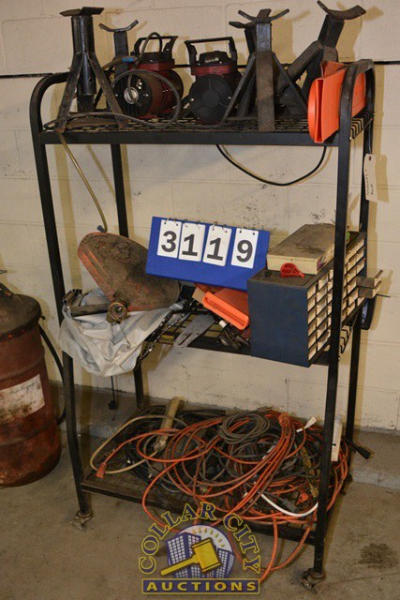 SHELVING UNIT WITH CONTENTS CONSISTING OF JACK STANDS, CHAINSAW BAR COVERS, PARTS BIN ORGANIZER, ELECTRIC PUMPS, LEAD CORDS