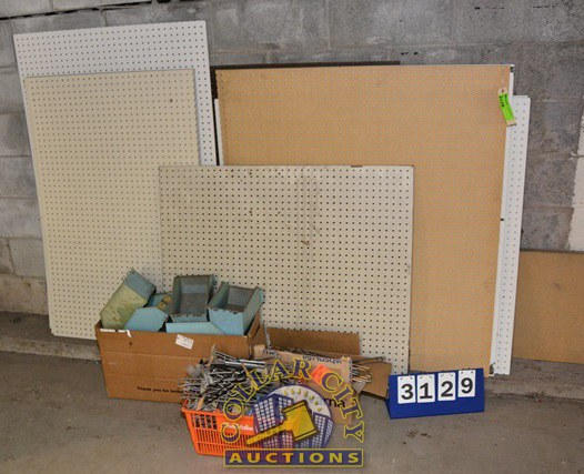 LOT OF PEG HOOKS AND ASSORTED PIECES OF PEGBOARD, LARGEST IS APPROX. 3' X 4'
