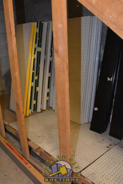 LOT OF GONDOLA SHELVING PARTS, ASSORTED PEGBOARD, ETC.