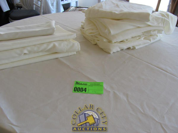 7 Round 90" ivory linens, 5 banquets 60x126 ivory linens (minor stains/imperfections)