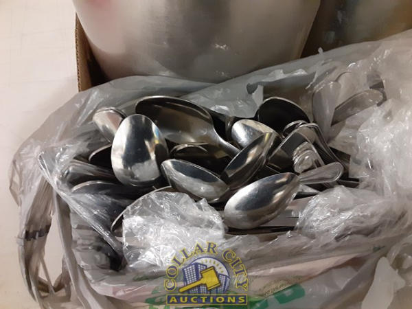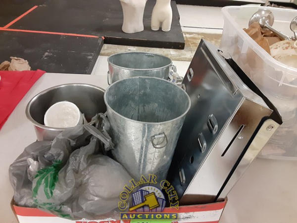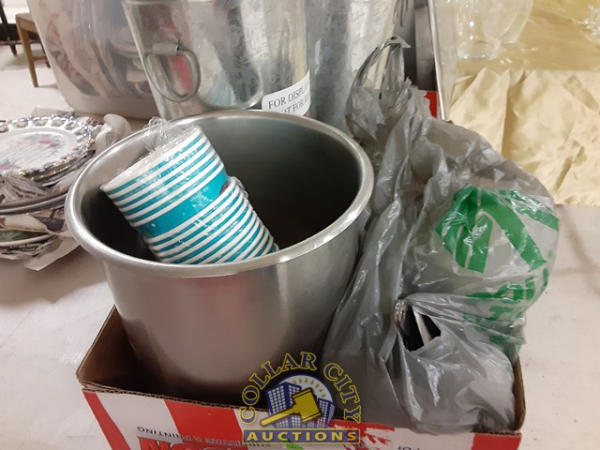 Weighted display buckets, paper towel dispenser, bag of spoons