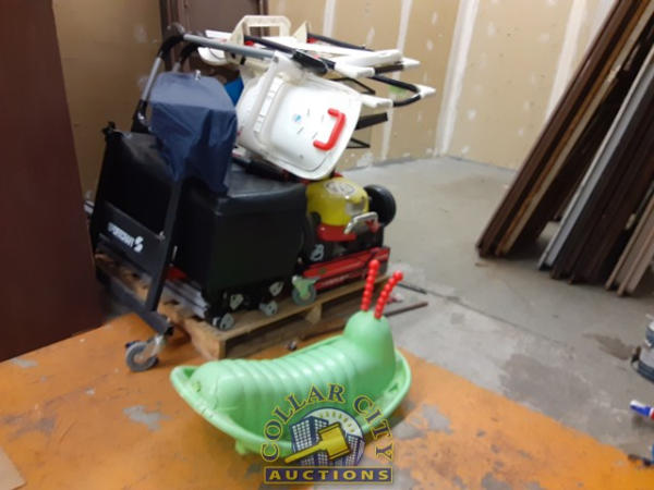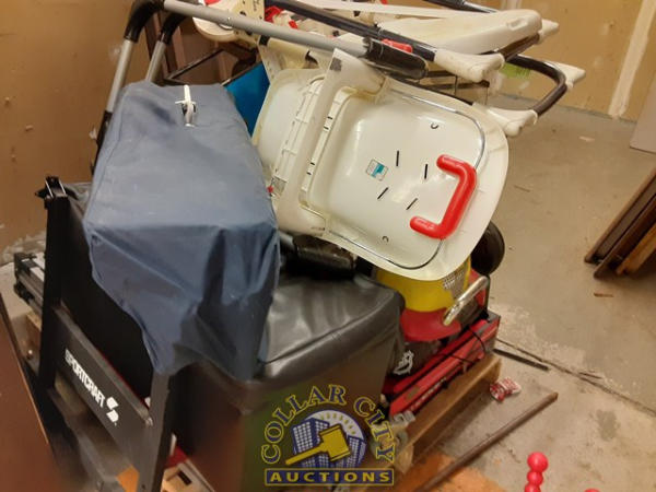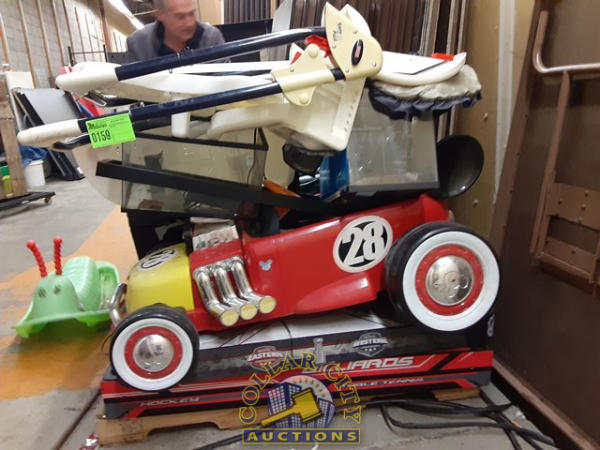 pallet of used baby items, 2 high chairs, 1 pack in play, green worm, Car, air hockey (all as is)