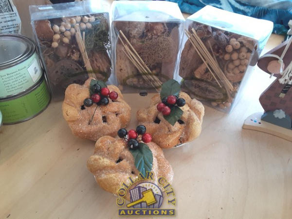 Lot of 15 scented boxed arrangements, tins of notes, scented apple pics & Misc. decorations.