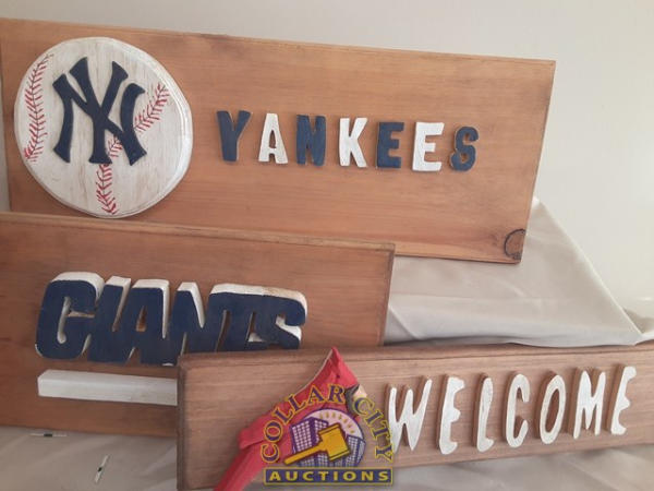 Hand made NY wooden signs, NY teams and Welcome sign.