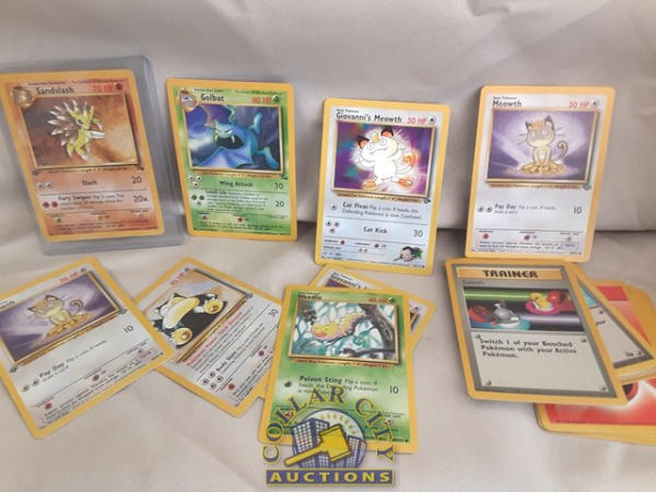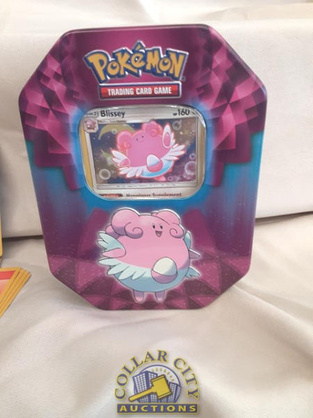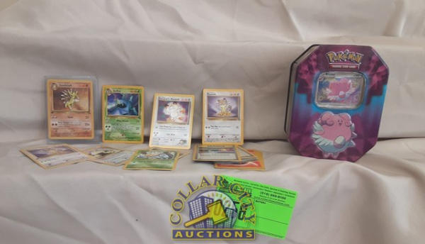 30 Pokemon cards and a tin w/ card