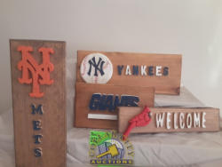 Hand made NY wooden signs, NY teams and Welcome sign.
