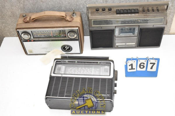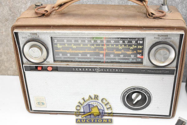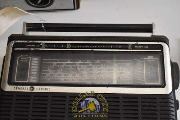 General Electric Model 3-5252B AC Battery Portable AM/FM Radio Cassette Recorder, powered by 6 D cells or 120 volt AC, 60 Hz Input, 15 watts and a General Electric Monitor 10 and a General Electric World Monitor Radio, 17 transistors (We do not guarantee the working condition or completeness of any of these items.)