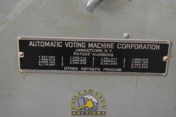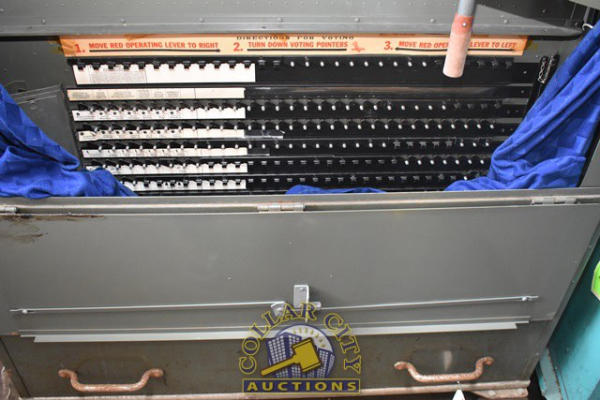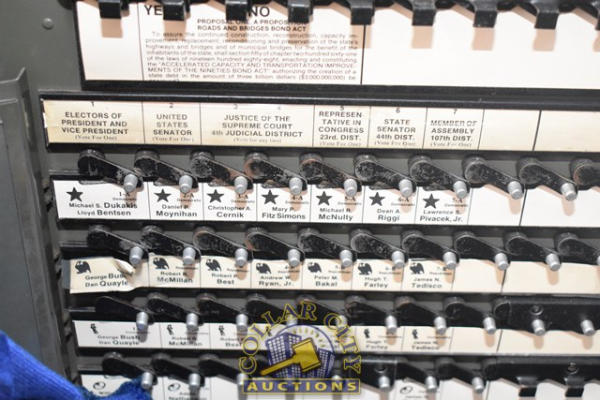Automatic Voting Machine Lever Operated Voting Machine. Still has tags in it from the last election. It was used last in the 1988 Presidential Election. No keys present. 1 door is open. (CUSTOMER IS RESPONSIBLE FOR REMOVAL. NO HELP WILL BE AVAILABLE.) (We do not guarantee the working condition or completeness of any of these items.)