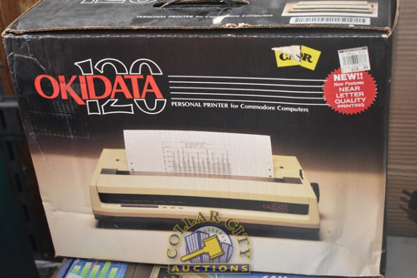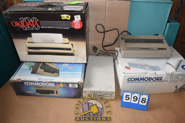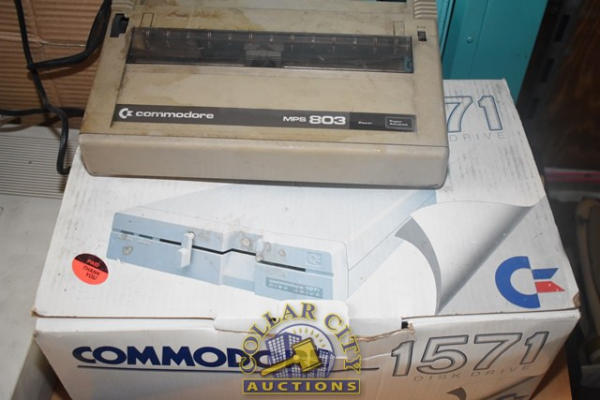 Commodore 64 Computer in box, a Commodore 1571 Disc Drive in Box, a Commodore MPS803, a Commodore 154I Disc Drive and a Okidata 120 Personal Printer for Commodore Computers (We do not guarantee the working condition or completeness of any of these items.)
