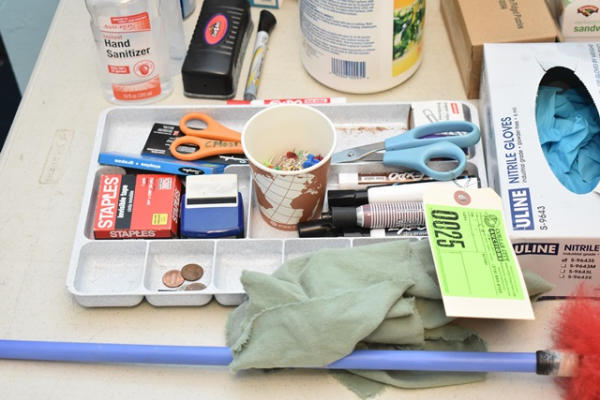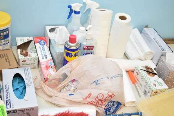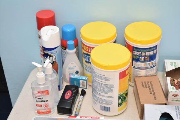 Office contents consisting of hand sanitizer, disinfecting wipes, garbage bags, paper towels, etc.