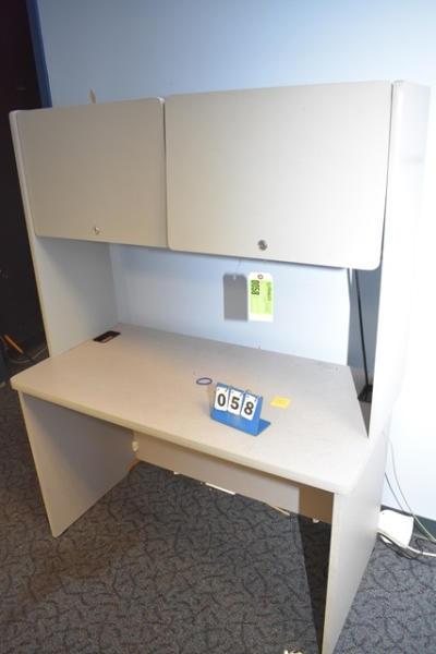 Wood desk (approx. 48" x 64") with 2 overhead shelves