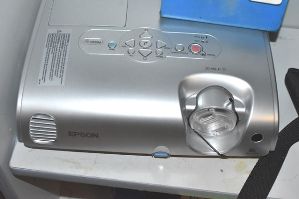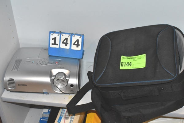 Shelf lot consisting of an Epson projector with 2 bags and tote of assorted wires, etc.
