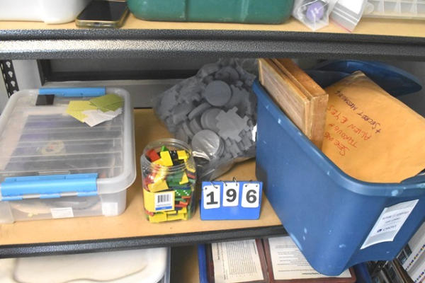 Shelf lot of assorted Dominoes, foam, puzzle pieces, educational books, etc.