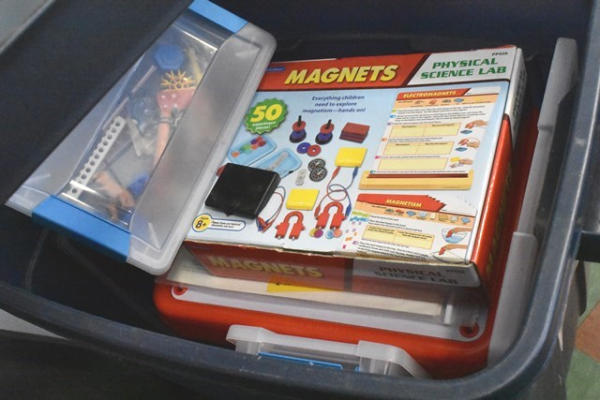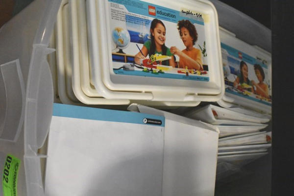 Shelf lot consisting of assorted Lego educational kits and physical science lab kits