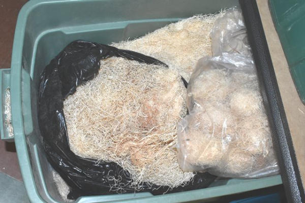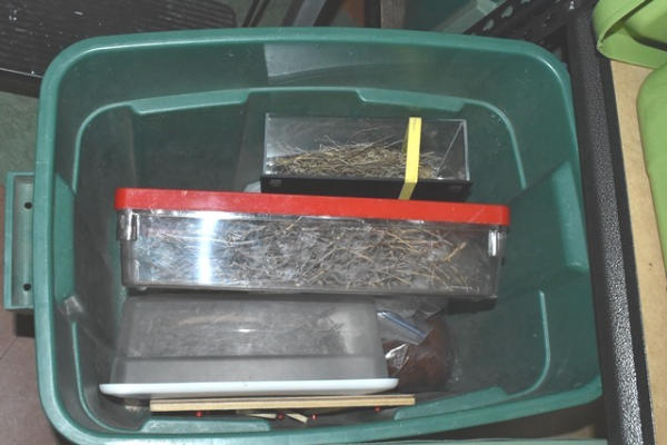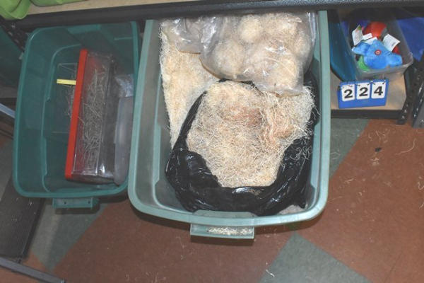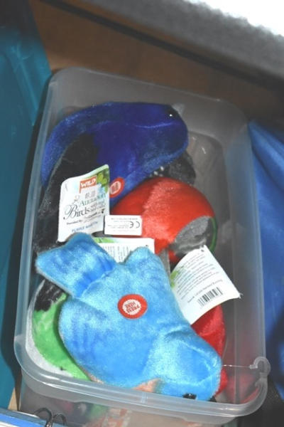 Shelf lot of assorted brush, tote of artificial straw, and stuffed animals